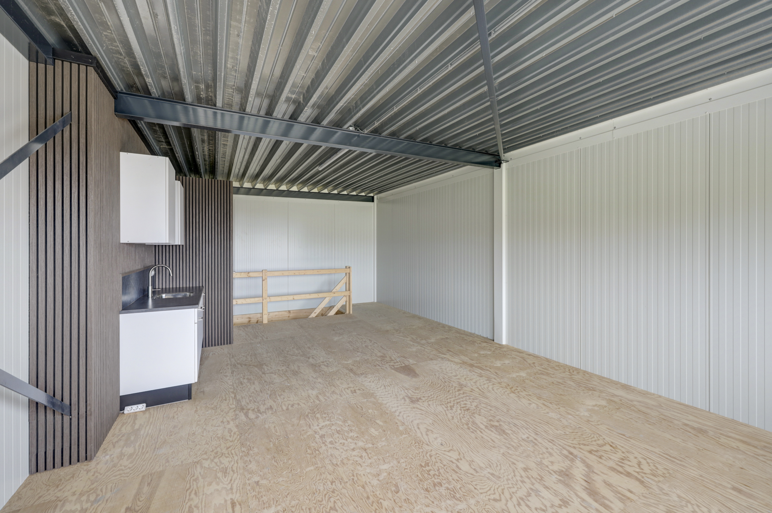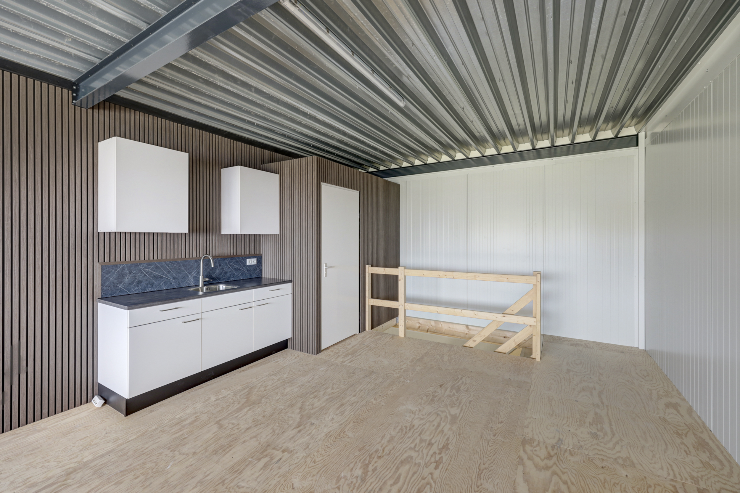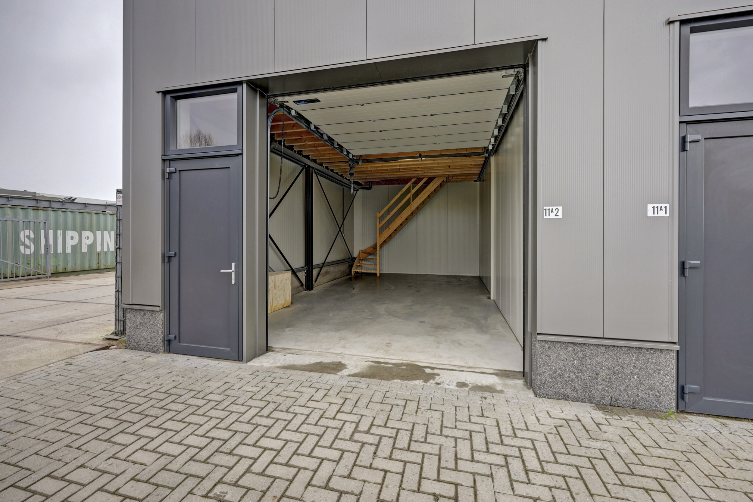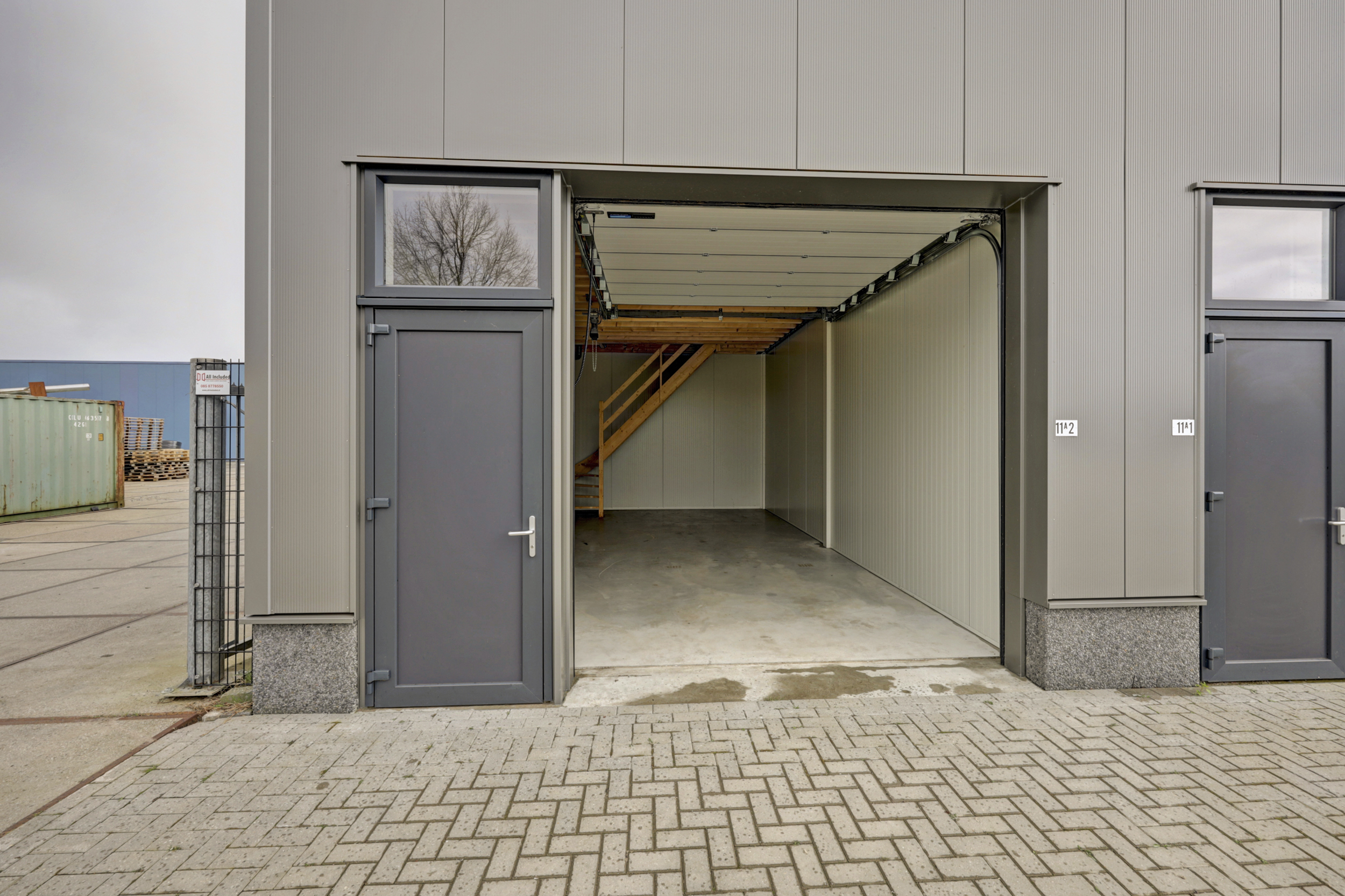 De begane grond is ingericht als bedrijfs-/werkruimte met een overheaddeur en separate loopdeur aan de voorzijde, ideaal voor opslag, lichte productie of werkplaatsactiviteiten. Via een vaste trap is de verdieping bereikbaar, waar zich een praktische werk-/kantoorruimte voorzien van pantry en toilet bevind.